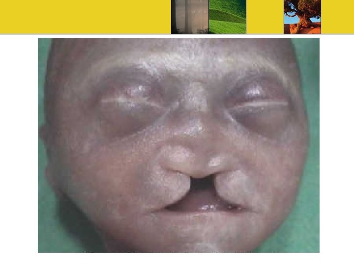 Nomenclature for associated facial malformations. Cyclopia (獨眼畸形併眼畸形) Ethmocephaly (篩形頭畸胎形) Cebocephaly (猴頭畸胎形) Face with median cleft lip