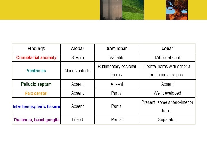 Semi-lobar Incomplete interhemispheric fissure Rudimentary cerebral lobes Olfactory tracts and bulbs absent or hypoplastic Abnormal corpus callosum Thalami completely/partly fused
