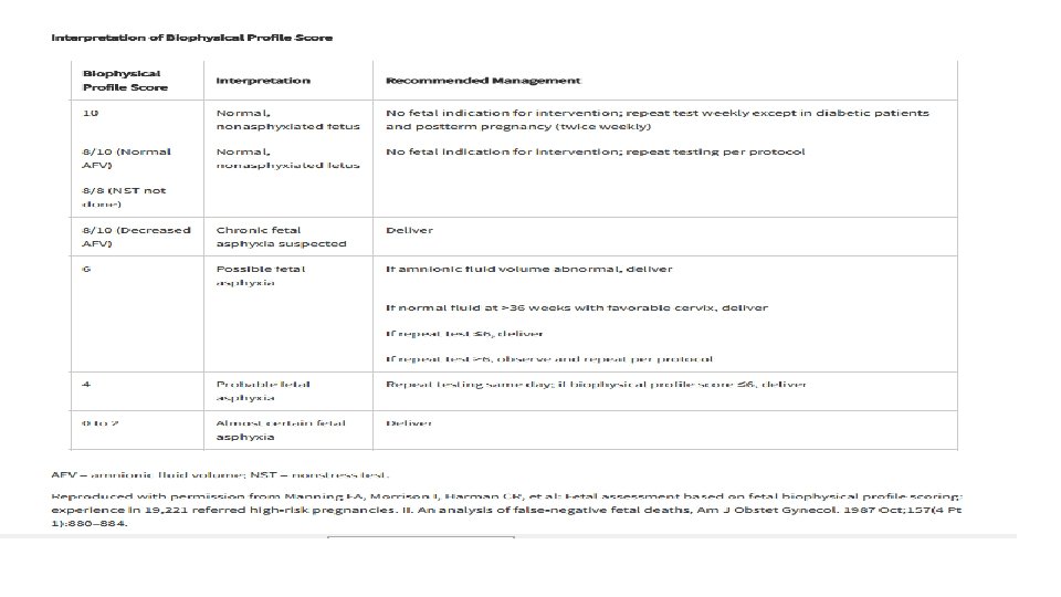 BIOPHYSICAL PROFILE v. Proposed by Manning and colleagues (1980) v. More accurate means of assessing fetal health than a single element. vrequire 30 to 60 minutes vmost common identifiable causes of fetal death in a normal biophysical profile include fetomaternal hemorrhage, umbilical cord accidents, and placental abruption (Dayal, 1999). vcomponents assessed: (1) heart rate acceleration, (2) breathing, (3) movements, (4) tone, and (5) amnionic fluid volume.