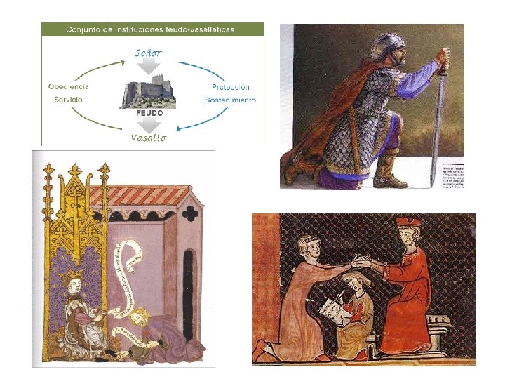 VASALLAJE: Se establece mediante la ceremonia del homenaje en la que el vasallo le jura a su señor fidelidad y auxilio (económico y militar) y éste le da a cambio el feudo (investidura) para que lo gobernase y viviera en él.
