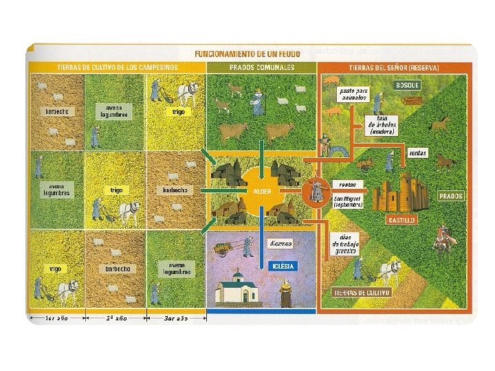 ALDEA MEDIEVAL Observa el dibujo: -Dónde vive el señor. -Qué nombre reciben las tierras que rodean su residencia. -A qué se dedican. -Quiénes las trabajan. -Qué instalaciones comunes ves. -Dentro de la aldea, cómo se llaman esas parcelas de tierra.
