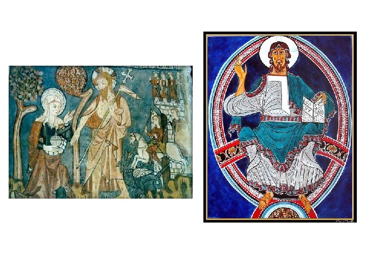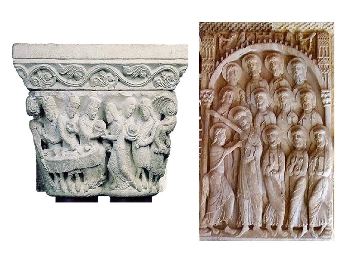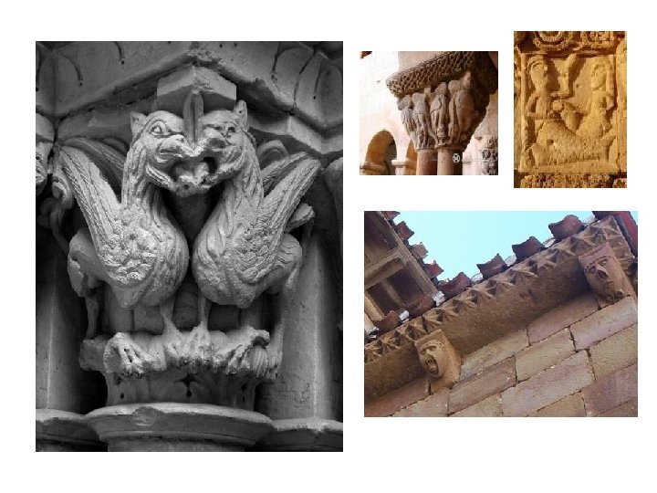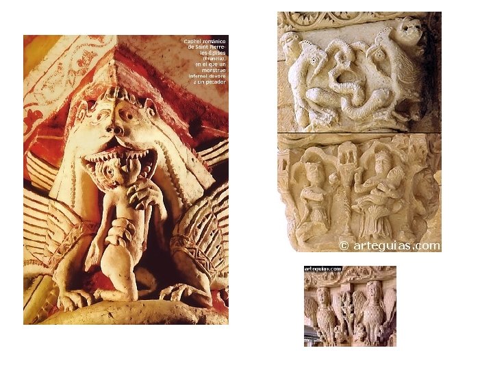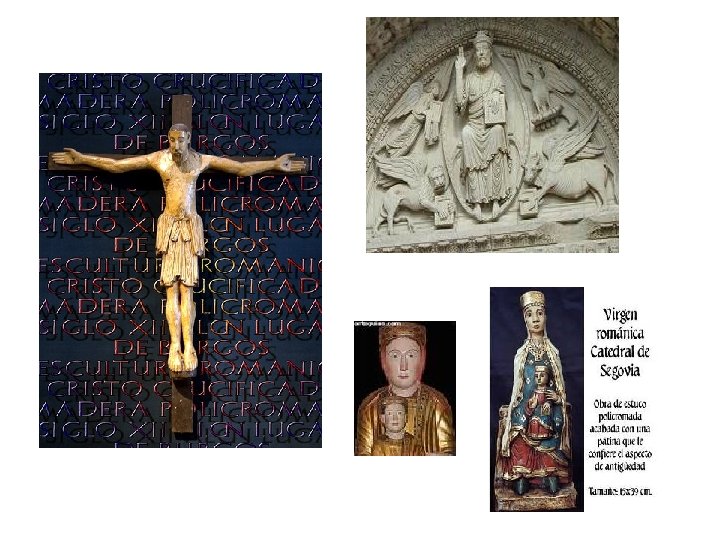 ESCULTURA Y PINTURA ROMÁNICA CARACTERÍSTICAS: -Están subordinadas a la arquitectura. -Tienen un fin didáctico: mostrar las verdades del cristianismo a una sociedad analfabeta. ESCULTURA: -Es antinaturalista y expresionista. -Es simétrica y rígida. -El relieve decora portadas y capiteles. -Temática preferida: el Crucificado (con cuatro clavos, rígido y sin expresión) y la Virgen con el Niño (sin establecer relación la madre con el hijo)