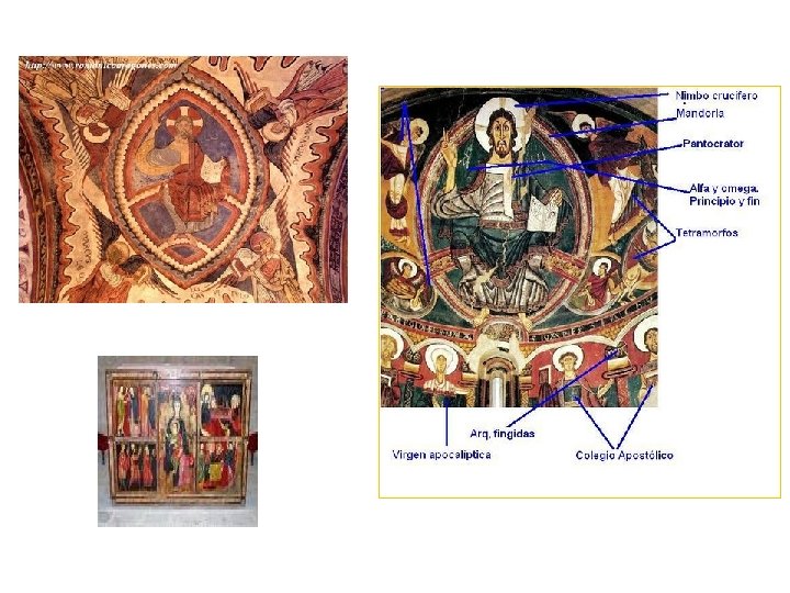 ESCULTURA Y PINTURA ROMÁNICA: PINTURA: -Técnica: al fresco -Localización: en bóvedas y ábsides. -Uso de colores planos, falta de perspectiva y movimiento. -Simetría y rigidez. -Fuerte carga expresionista.