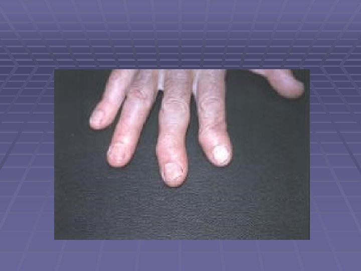 Rheumatoid Arthritis § Definition: Chronic, systemic inflammatory disease with persistent and progressive synovitis in peripheral joints § Peak incidence 4 th-6 th decades § Associated with HLA DR 4 § Sx: Affects small joints of hands and feet. Pts c/o difficulty with tasks like buttoning clothes
