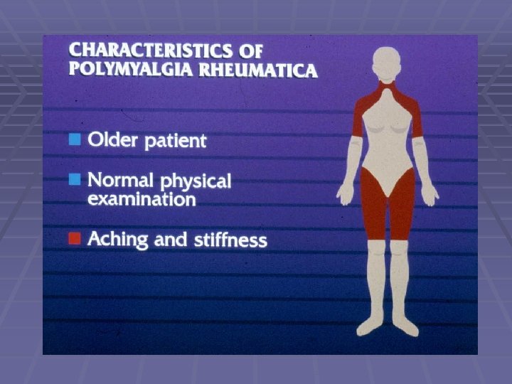 Polymyalgia Rheumatica § Morning stiffness § Prominent finding, lasting 1 -4 hours § Pain and stiffness in shoulder and hip girdle § Problems getting out of bed, rising from a chair, combing hair § In 33% of pts aching is so severe that self care becomes difficult § Low grade fever is most frequent sx, then wt loss, fatigue § If muscles of neck and shoulder are involved pts may be misdiagnosed with frozen shoulder or cervical myelopathy