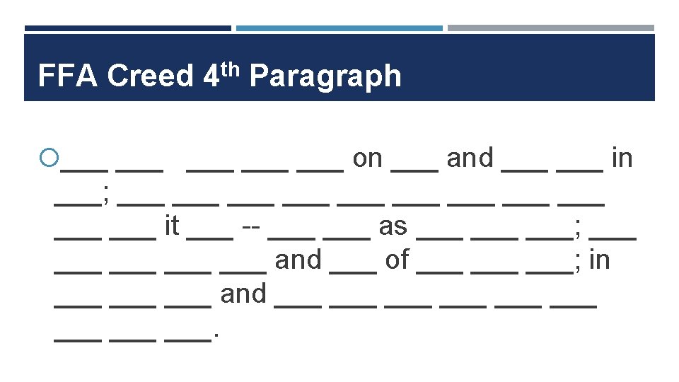 FFA Creed 4 th Paragraph I ___ in less dependence on ___ and more power in ___; in the life abundant and enough ___ wealth to help ___ it so--for ___ as well as myself; in less need for charity and more of it when needed; in being ___ myself and playing ___ with those ___ happiness depends upon me.