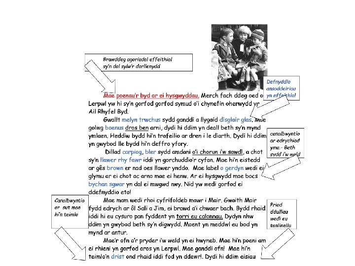 Portread Personoliaeth Saif ei wallt piws llachar fel blew cath wedi ei dychryn. Yn ei glust dde, mae clustdlws llachar yn hongian yn llipa a llewys ei grys-t carpiog wedi rhwygo fel tudalen flêr mewn llyfr. Mae ganddo lygaid mawr brown yn chwyrnu’n slei ar bawb a’i wyneb brawychus yn syllu’n filain arnom. Cryna’r llawr fel daeargryn wrth iddo darannu i lawr y grisiau fel ceffyl gwyllt. Tafla ei ddillad ar lawr ei lofft gan wylltio mam yn gacwn. Er ei bod hi’n pregethu dragwyddol ac yn bloeddio, ‘Cadw dy ddillad yn drefnus!’, dydy o ddim yn malio’r un botwm corn, dim ond chwerthin am ei phen. Ychydig iawn o amynedd sydd ganddo – yn sicr does ganddo ddim amynedd efo merch fach ddiniwed a da fel fi. Fy mrawd mawr ydy o. iaith gyfoethog cyffelybiaeth disgrifio - golwg iaith gyfoethog - ansoddair iaith gyfoethog - idiom