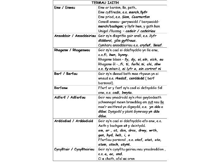 Cyfathrebu a chreu naws Oes yna’r fath beth ag arallfydwyr? Annwyl gyfeillion, Diolch i chi am roi eich amser prin i ddod yma i wrando arna’i heddiw. Ond na phoener, dwi ddim am eich dychryn na cheisio codi gwallt eich pen [dim fel y rhain gyferbyn â mi]. Achos dwi wedi dod yma i’ch sicrhau chi mai rwts llwyr ydi’r miri arallfydwyr ‘ma – heb os nac oni bai, toes na’m ffasiwn bethau yn bod siwr iawn! Rydach chi’n griw deallus iawn mi wela’, felly gofynnwch i’ch hunain pa bryd oedd y tro diwetha i chi weld soser yn hedfan? Neu ddyn bach gwyrdd? Mi fentra’i ddeud gyfeillion na welodd yr un copa walltog ohonoch chi erioed ddim byd o’r fath. Mi fydd fy ngwrthwynebydd yn taeru’r du yn wyn eu bod nhw yma, yn ein plith ni, yn cadw llygaid barcud ar bob symudiad. Ond os ydyn nhw yma, yn lle maen nhw? Meddyliwch am y peth gyfeillion, os oes ‘na gymaint ohonyn nhw pam nad oes mwy ohonan ni wedi eu gweld nhw? Mynegi barn bendant Berf orchmynnol Cwestiwn rhethregol
