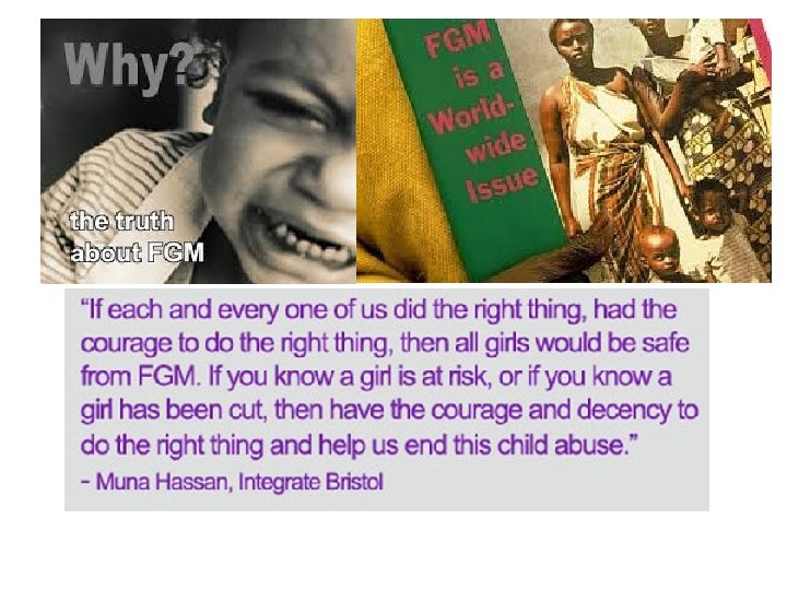 Who is at risk • FGM is most commonly carried out when a girl is 5 -8 years old. However it can happen at any age before a girl or woman is married or pregnant. Some girls are babies when FGM is carried out. • In the UK, girls from the Somali, Kenyan, Sudanese, Sierra Leonean, Egyptian, Nigerian, Eritrean, Yemeni, Kurdish and Indonesian communities are most at risk of FGM.