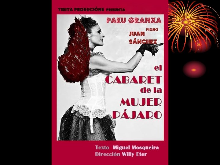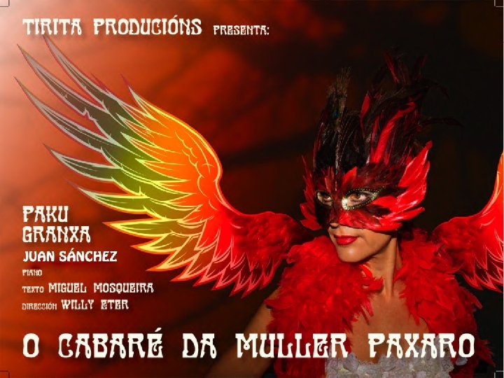 UN GRAN CABARET CON CANCIONES EN ALEMÁN, FRANCÉS, ITALIANO, GALLEGO Y JAPONÉS. . UNA DIVA ALADA, Y UN GRAN PIANISTA EN DIRECTO. Tirita Producións presenta su nuevo espectáculo musical, humorístico y poético : EL CABARET DE LA MUJER PÁJARO, de Miguel Mosqueira. Protagonizado por PAKU GRANXA, acompañada de JUAN SÁNCHEZ al piano. Dirigido por Willy Eter.