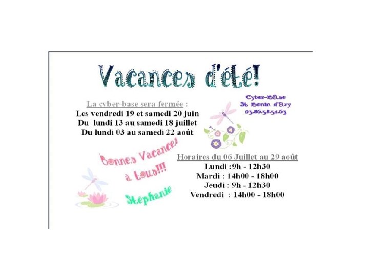 Grammaire (İngilizce de açıkla) • • • • • Il est 7 heures On ouvre la boulangerie à 7 heures. Il est midi (12 : 00) Il est midi et demi (12 : 30) Il est minuit Il est 8 heures du matin Il est 8 heures du soir Il est 10 heures 5 (10 : 5) Il est 10 heures moins 5 (9 : 55) Il est 11 heures et demi (11 : 30) De 9 heures à 12 heures et de 13 h à 17 h (from to) Jusqu’ à (until) Lundi matin de 9 heures mecredi soir à 10 heures Du lundi matin au vendredi soir A partir du panneau complétez les phrases : Ouvert …. 9 : 30 …. 19 : 30 Fermé…………
