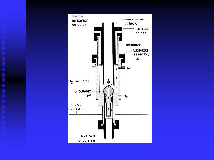 FID Gas Meter/Detector 1. FIDs consist of a hydrogen/air flame and a collector plate 2. effluent from column is mixed with hydrogen and air and then ignited electrically 3. most organic compounds produce ions and electrons that can conduct electricity through the flame 4. electrode above the flame collects the ions 5. number of ions hitting the collector is measured and a signal is generated