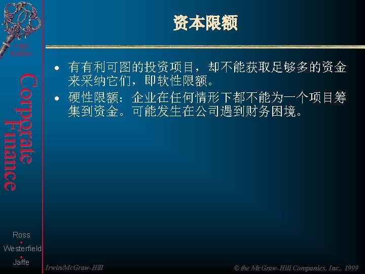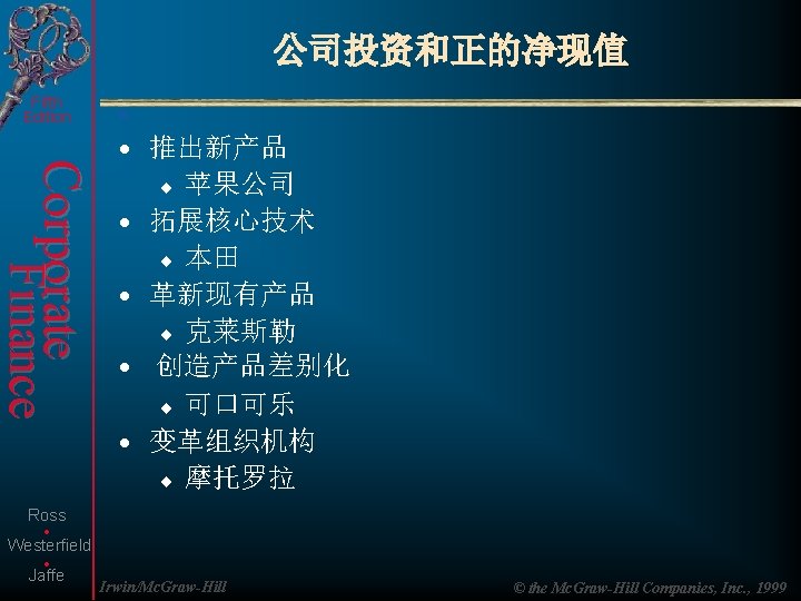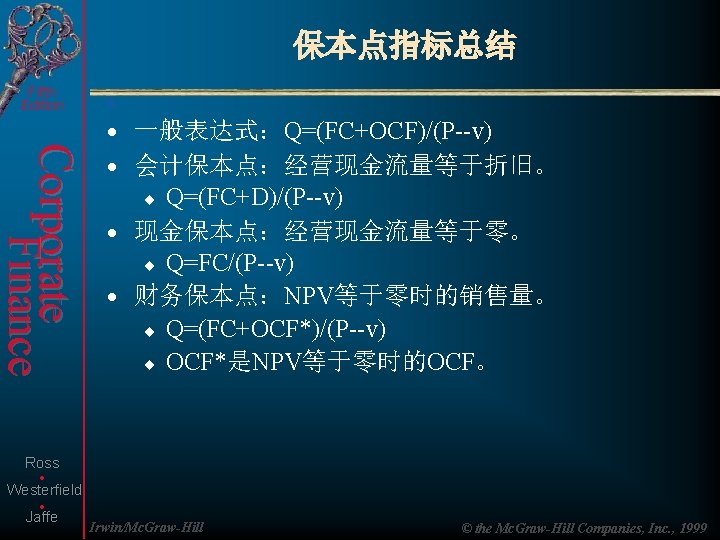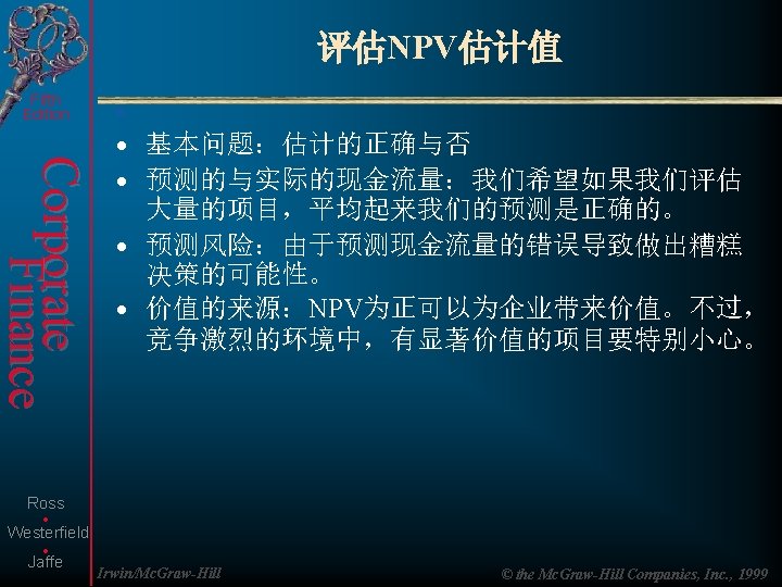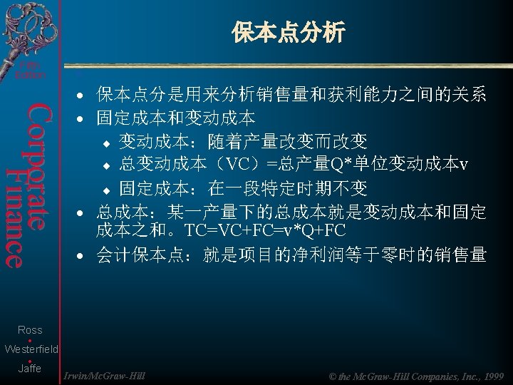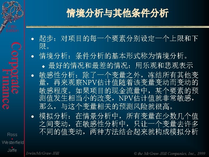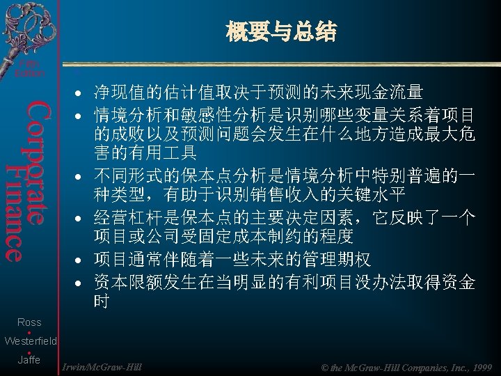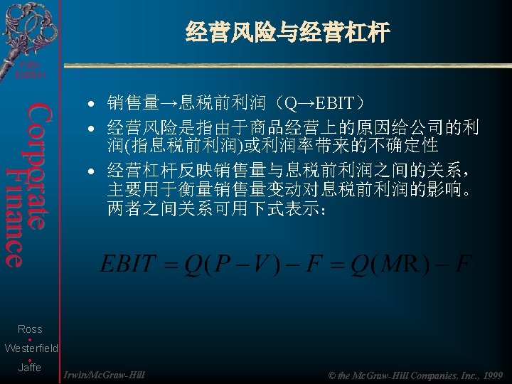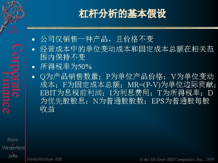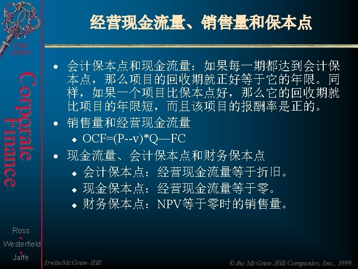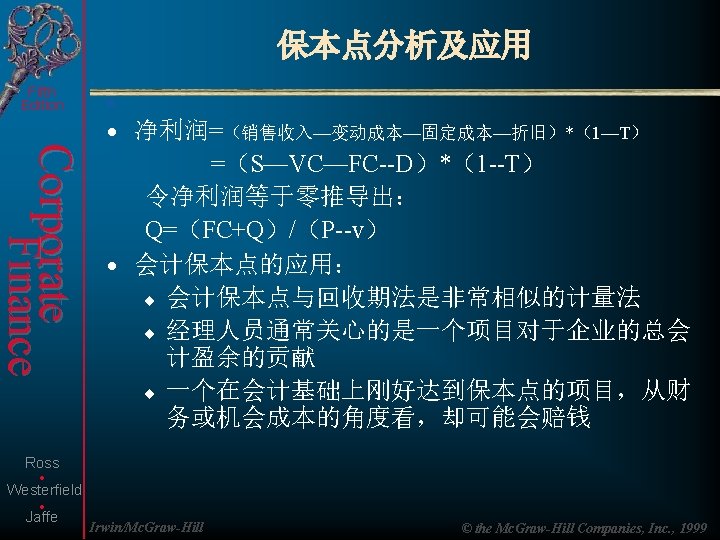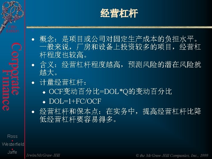 Fifth Edition Corporate Finance 11 1 NPV 11 Slides: 20 Download presentation 第十一章项目分析与评估 Fifth Edition Corporate Finance · · · · 11. 1 评估NPV评估值 11. 2 情景分析与其他条件分析 11. 3 保本点分析 11. 4 经营现金流量、销售点和保本点 11. 5 经营杠杆 11. 6 资本限额 11. 7 概要与总结 . . Ross Westerfield Jaffe Irwin/Mc. Graw-Hill © the Mc. Graw-Hill Companies, Inc. , 1999 杠杆分析 Fifth Edition Corporate Finance 经营杠杆 Q 财务杠杆 EBIT EPS 总杠杆 . . Ross Westerfield Jaffe Irwin/Mc. Graw-Hill © the Mc. Graw-Hill Companies, Inc. , 1999 经营风险与经营杠杆 Fifth Edition Corporate Finance . . 项目 销售收入 减: 变动成本总额 边际贡献总额 减: 固定成本总额 息税前利润 Q 0=20000 件 P=$5 t=0 100000 60000 40000 20000 t=1 110000 60000 44000 20000 24000 % 10% 10% 20% V=$3 F=$20 000 Q 1=22 000 件 Ross Westerfield Jaffe Irwin/Mc. Graw-Hill © the Mc. Graw-Hill Companies, Inc. , 1999 经营杠杆系数(DOL) Fifth Edition Corporate Finance . . Ross Westerfield Jaffe Irwin/Mc. Graw-Hill © the Mc. Graw-Hill Companies, Inc. , 1999 经营杠杆系数(DOL) Fifth Edition Corporate Finance . . Ross Westerfield Jaffe Irwin/Mc. Graw-Hill © the Mc. Graw-Hill Companies, Inc. , 1999 不同销售水平下的经营杠杆系数 Fifth Edition Corporate Finance . . 销售量 0 1 000 2 000 3 000 4 000 5 000 6 000 7 000 8 000 10 000 息税前利润 -100 000 - 75 000 - 50 000 - 25 000 0 25 000 50 000 75 000 100 000 150 000 经营杠杆系数 0. 00 - 0. 33 - 1. 00 - 3. 00 无穷大 5. 00 3. 00 2. 33 2. 00 1. 67 Ross Westerfield Jaffe Irwin/Mc. Graw-Hill © the Mc. Graw-Hill Companies, Inc. , 1999 不同销售水平下的经营杠杆系数 Corporate Finance Operating Leverage Fifth Edition Q(unit) . . Ross Westerfield Jaffe Irwin/Mc. Graw-Hill © the Mc. Graw-Hill Companies, Inc. , 1999 Fifth Edition Corporate Finance 欢迎批评指正! 谢谢各位! . . Ross Westerfield Jaffe Irwin/Mc. Graw-Hill © the Mc. Graw-Hill Companies, Inc. , 1999