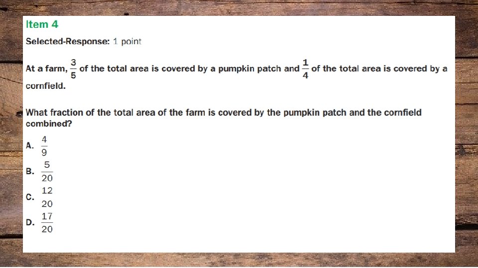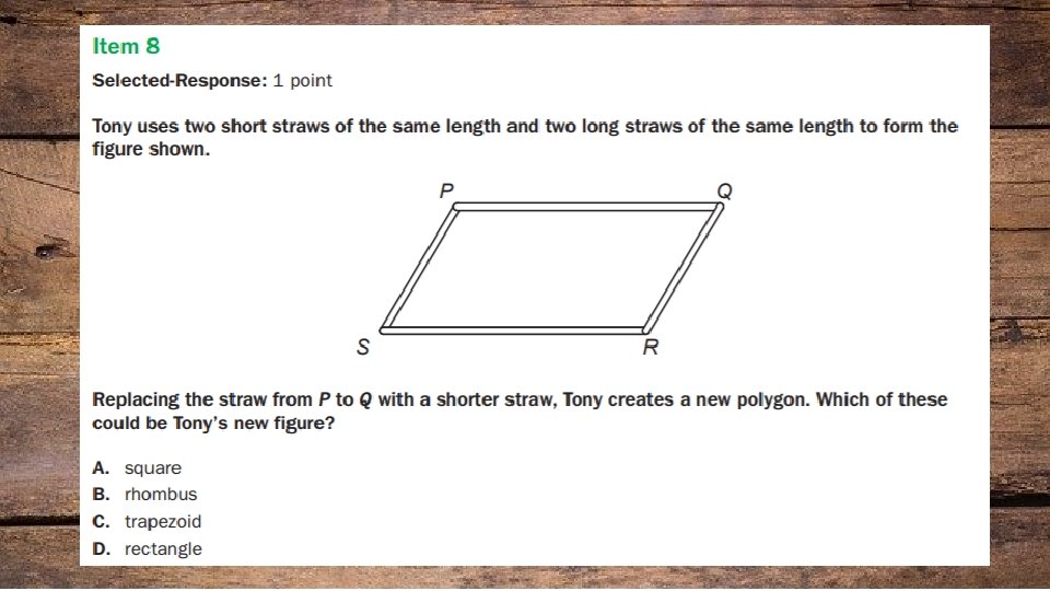 Item types: • Selected response (multiple choice. ) • Technology Enhanced • Multi-select • Multi-part • Drag and drop • Coordinate graph • Line Plot • Bar Graph • Number line