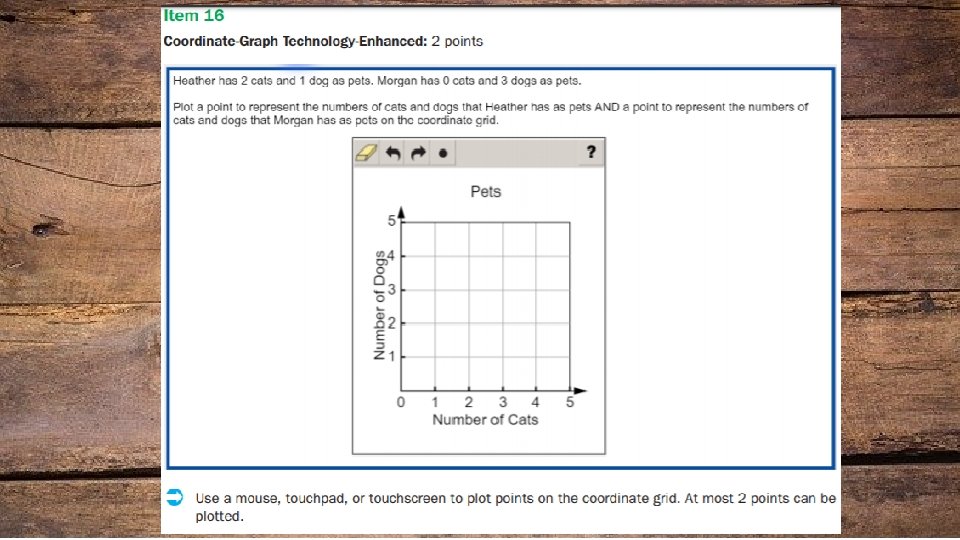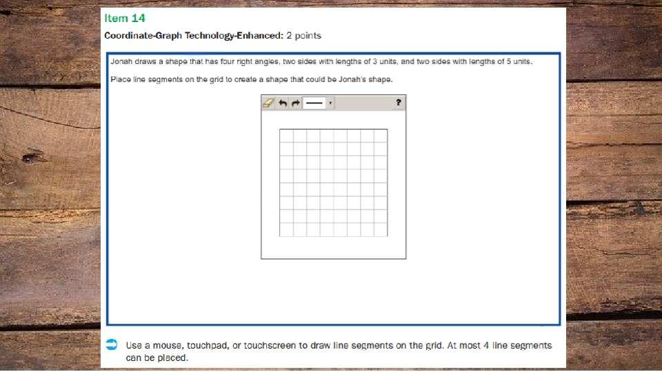 Item Types • In multi-select questions, the student is asked to pick two or three correct responses from five or six answer options. (Multiple Choice) • In multi-part questions, the student responds to a two-part item that combines multiple-choice and/ or multi-select questions. For these item types, the student selects the responses from the choices provided or creates a response. • In drag-and-drop questions, the student uses a mouse, touchpad, or touchscreen to move responses to designated areas on the screen. • In coordinate-graph questions, the student uses a mouse, touchpad, or touchscreen to draw lines and/ or plot points on a coordinate grid on the screen. • In line-plot questions, the student uses a mouse, touchpad, or touchscreen to place Xs above a number line to create a line plot. • In bar-graph questions, the student uses a mouse, touchpad, or touchscreen to select the height of each bar to create a bar graph. • In number-line questions, the student uses a mouse, touchpad, or touchscreen to plot a point and/or represent inequalities.