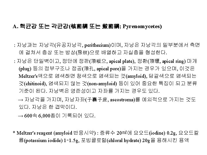 그림. 핵균강의 자낭 정부조직 1. Clavicipitaceae, 2. Hypocreaceae, 3. Nypomycetaceae, 4. Diatryaceae, 5. Diaportheaceae, 6∼ 7. Amphisphaeriaceae, 8. Calniaceae, 9. Xylariaceae * 6∼ 9는 Meltzer's reagent로 청색으로 염색