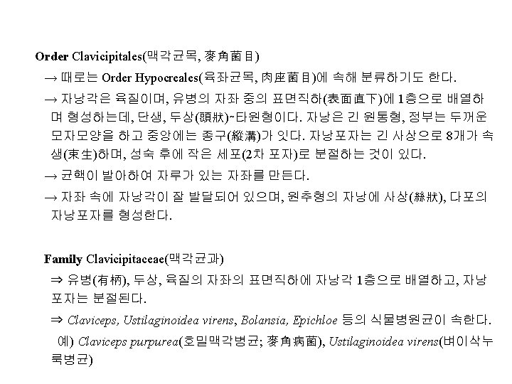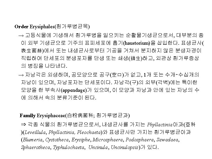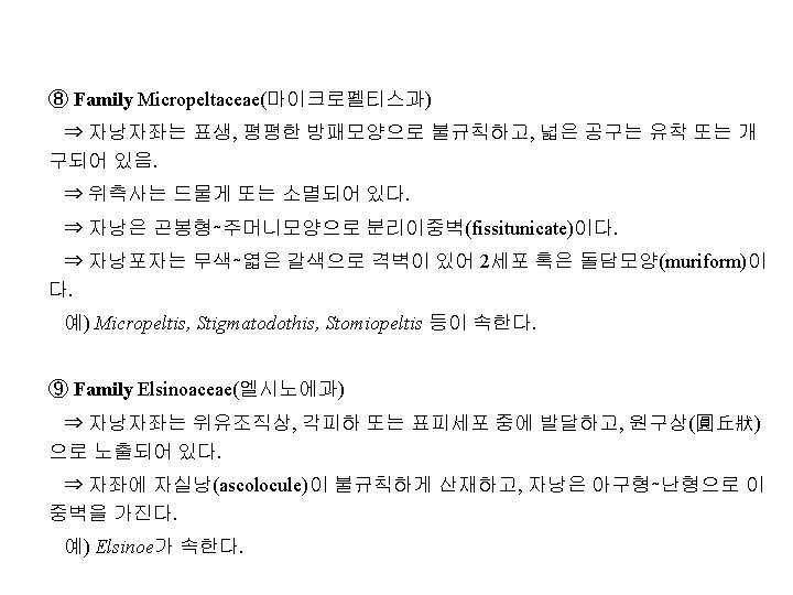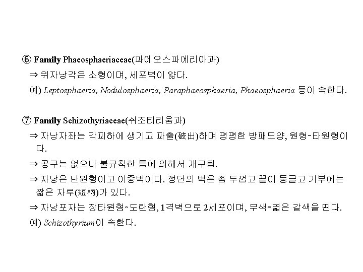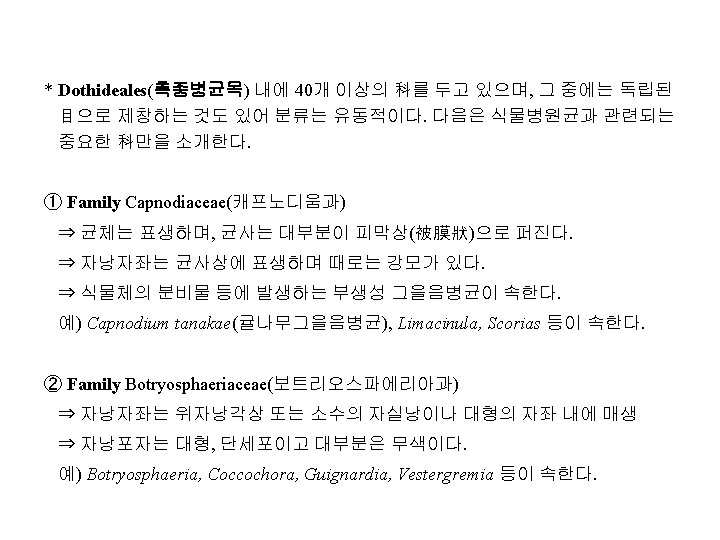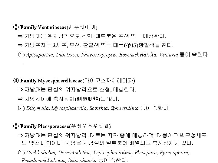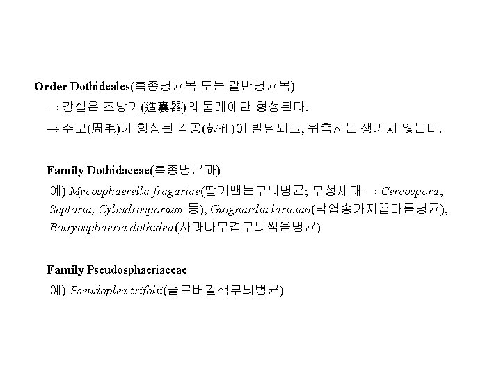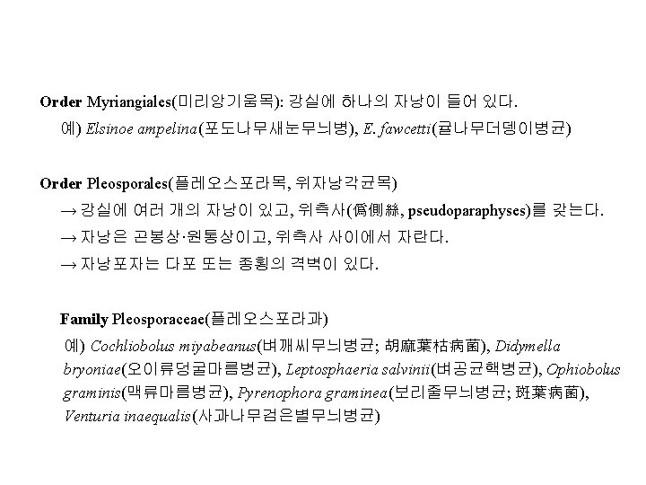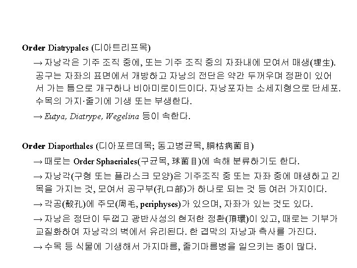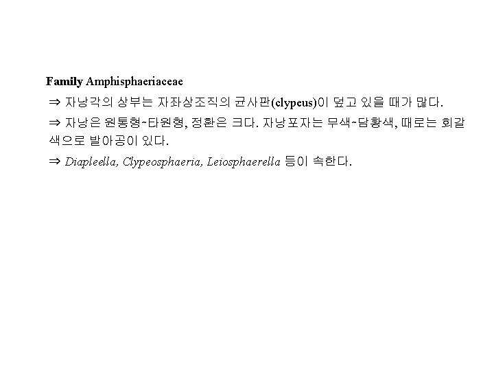 Family Diaporthaceae(동고병균과, 胴枯病菌科) 예) Cryphonectria parasitica(구학명; Endothia, 밤나무줄기마름병균), Diaporthe citri(귤나무수지병균, 樹脂病菌; 무성세대, Phomopsis), D. nomurai Hara (뽕나 무줄기마름병균; 胴枯病菌), D. sojae(콩미이라병균; 黑點病菌), Gaeumannomyces graminis(벼. 보리마름병균; 立枯病菌), Gnomonia erythrostoma(벚나무잎마름병균; 葉枯病菌), Magnaporthe grisea (Hebert) Barr ( 벼도열병균, 稻熱病菌; 무성세대, Pyricularia), Leucostoma persooni(복숭아나무 줄기마름병균; 胴枯病菌; 구명 Valsa), L. ceratosperma (Tode ex Fries) Maire (사 과나무부란병균; 腐爛病菌) Family Amphisphaeriaceae 예) Physalospora baccae(포도꼭지마름병균)