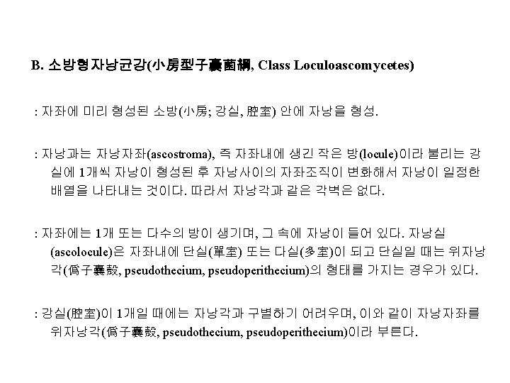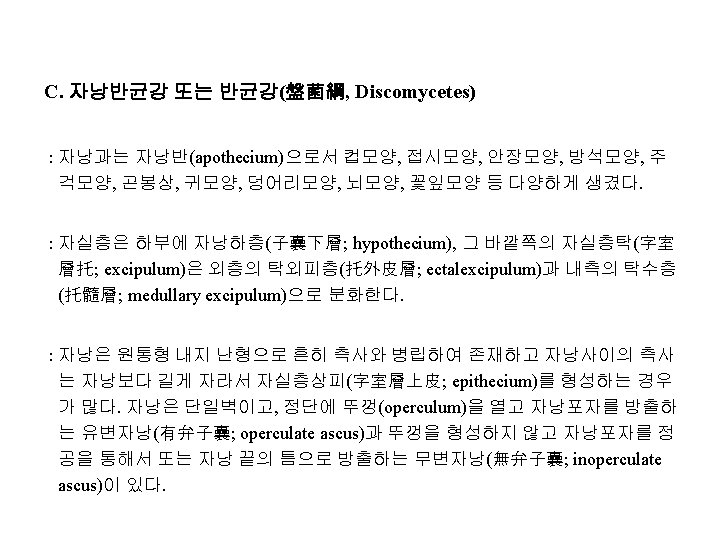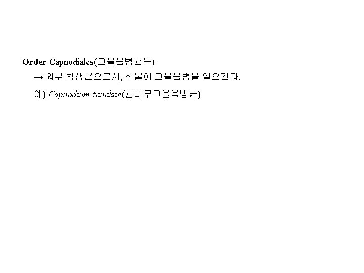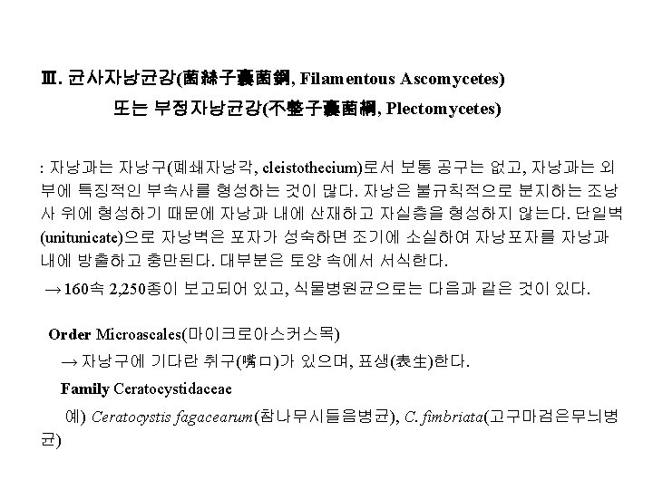 Ⅱ. 원자낭균강(原子囊菌綱, Protoascomycetes) 또는 효모강(酵母綱, Ascomycetous Yeasts) : 영양체는 단세포 또는 균사체로, 때로는 세포가 연결되어 위균사체(僞菌絲體, pseudomycelium)가 된다. 대부분의 종은 효모(yeast)이다. Order Saccharomycetales Family Metschnikowiaceae 예) Nematospora