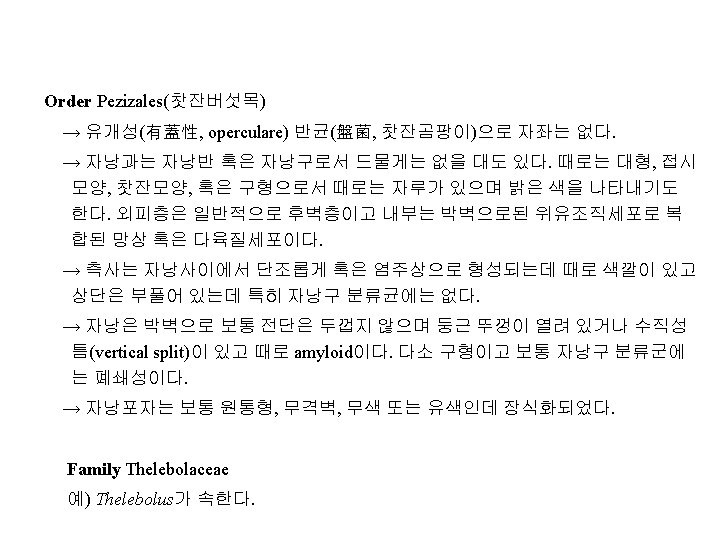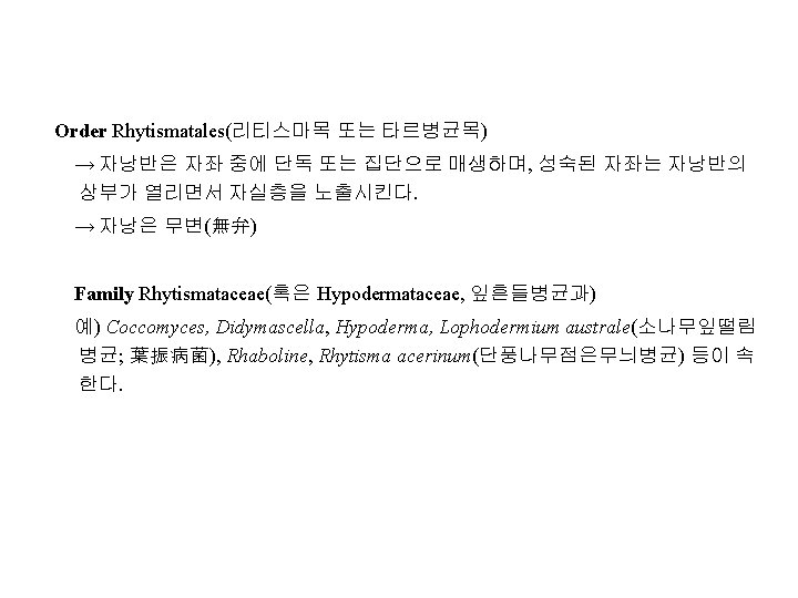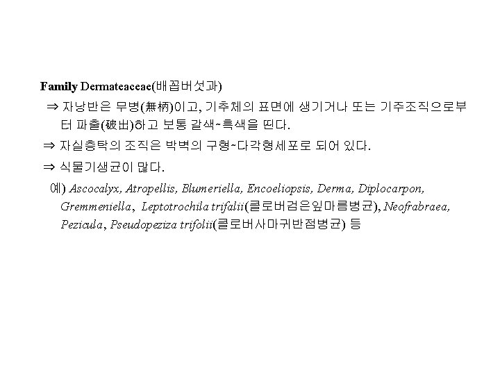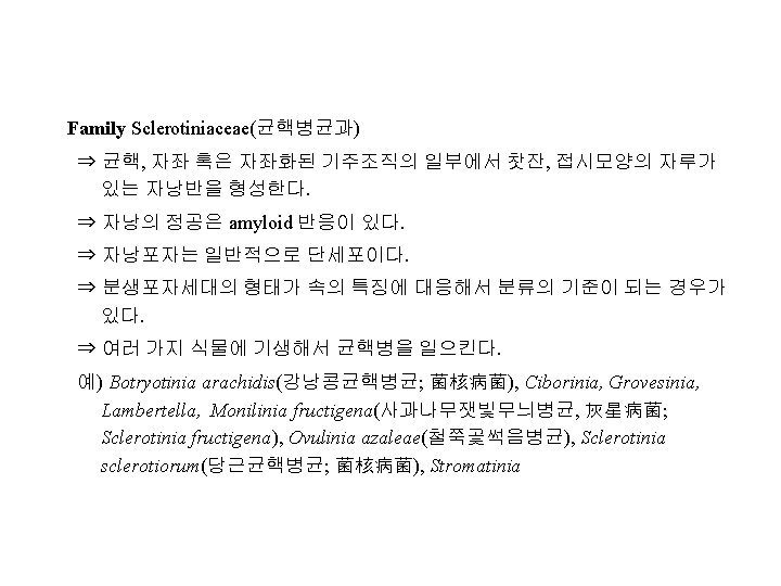 Family Hyaloscyphaceae(하이알로스키파과) 예) Trichoscyphella wilkommii(낙엽송암종병균) Family Sclerotiniaceae(균핵병균과) 예) Botryotinia arachidis(강낭콩균핵병균; 菌核病菌), Monilinia fructigena(사과나 무잿빛무늬병균, 灰星病菌; Sclerotinia fructigena), Ovulinia azaleae(철쭉꽃썩음 병균), Sclerotinia sclerotiorum(당근균핵병균; 菌核病菌) Family Helotiaceae(헬로티움과) 예) Chloroscypha seaveri(침엽수흑립엽고병균, 黑粒葉枯病菌)
