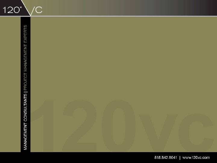 Project Management Jargon • • • Constraint Critical Path/Task Decomposition Duration/Effort Event chain methodology • Float/Slack • Lag © 2014 120 VC Holdings, Inc. All rights reserved • Mitigation • Progressive Elaboration • Project Network Diagram • RA(S)CI Chart • RADIO/IRAAD List • Wideband Delphi