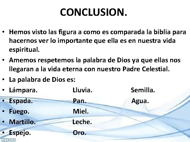 CONCLUSION. • Hemos visto las figura a como es comparada la biblia para hacernos ver lo importante que ella es en nuestra vida espiritual. • Amemos respetemos la palabra de Dios ya que ellas nos llegaran a la vida eterna con nuestro Padre Celestial. • La palabra de Dios es: • Lámpara. Lluvia. Semilla. • Espada. Pan. Agua. • Fuego. Miel. • Martillo. Leche. • Espejo. Oro.