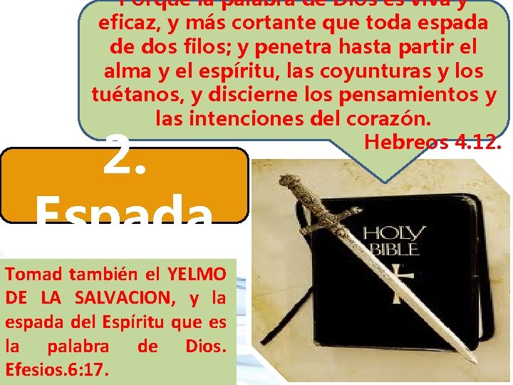 Porque la palabra de Dios es viva y eficaz, y más cortante que toda espada de dos filos; y penetra hasta partir el alma y el espíritu, las coyunturas y los tuétanos, y discierne los pensamientos y las intenciones del corazón. Hebreos 4. 12. 2. Espada Tomad también el YELMO DE LA SALVACION, y la espada del Espíritu que es la palabra de Dios. Efesios. 6: 17.