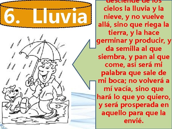 6. Lluvia desciende de los cielos la lluvia y la nieve, y no vuelve allá, sino que riega la tierra, y la hace germinar y producir, y da semilla al que siembra, y pan al que come, así será mi palabra que sale de mi boca; no volverá a mí vacía, sino que hará lo que yo quiero, y será prosperada en aquello para que la envié.