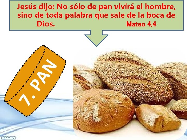 7. PA N Jesús dijo: No sólo de pan vivirá el hombre, sino de toda palabra que sale de la boca de Dios. Mateo 4. 4