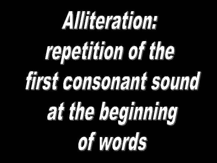 Alliteration (continued) Alliteration: when the first sounds in words repeat. Example Peter Piper picked a pickled pepper. We lurk late. We shoot straight.