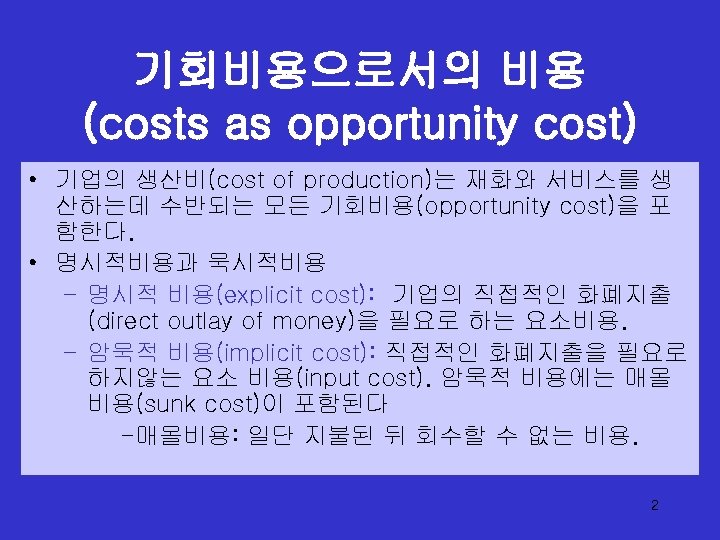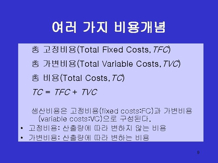 한계비용(marginal cost) • 한계비용 (MC): 산출량을 한 단위 증가시킬 때 총비용의 증가분. * How much does it cost to produce an additional unit of output? 12