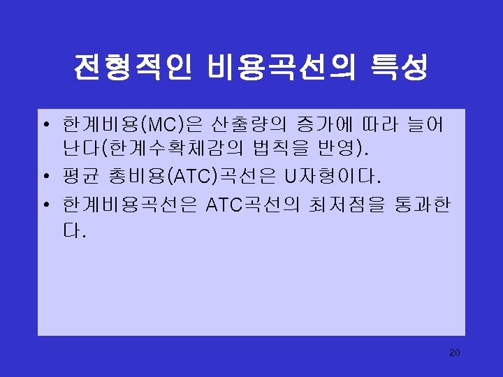 Figure 6 Big Bagel’s Cost Curves (b) Marginal- and Average-Cost Curves Costs $3. 00 2. 50 MC 2. 00 1. 50 ATC AVC 1. 00 0. 50 AFC 0 2 4 6 8 10 12 14 Quantity of Output (bagels per hour) 19 Copyright © 2004 South-Western