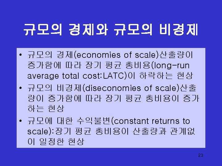 Figure 7 Average Total Cost in the Short and Long Run Average Total Cost ATC in short run with small factory ATC in short run with medium factory large factory ATC in long run $12, 000 10, 000 Economies of scale 0 Constant returns to scale 1, 000 1, 200 Diseconomies of scale Quantity of 22 Cars per Day Copyright © 2004 South-Western