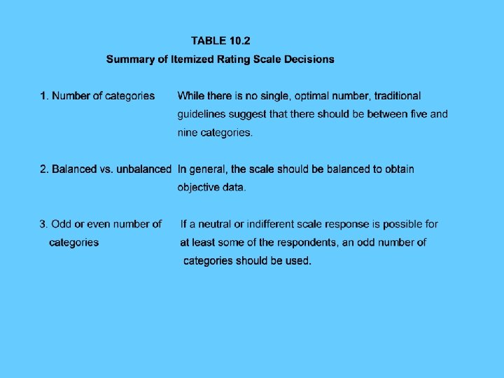 Figure 10. 1 Relationship of Noncomparative Scaling to the Previous Chapters and the Marketing Research Process Focus of This Chapter Relationship to Previous Chapters • Continuous Rating Scales • Research Design Components (Chapter 3) • Itemized Rating Scales • Basic Types of Scales (Chapter 9) Relationship to Marketing Research Process Problem Definition Approach to Problem Research Design Field Work Data Preparation and Analysis Report Preparation and Presentation