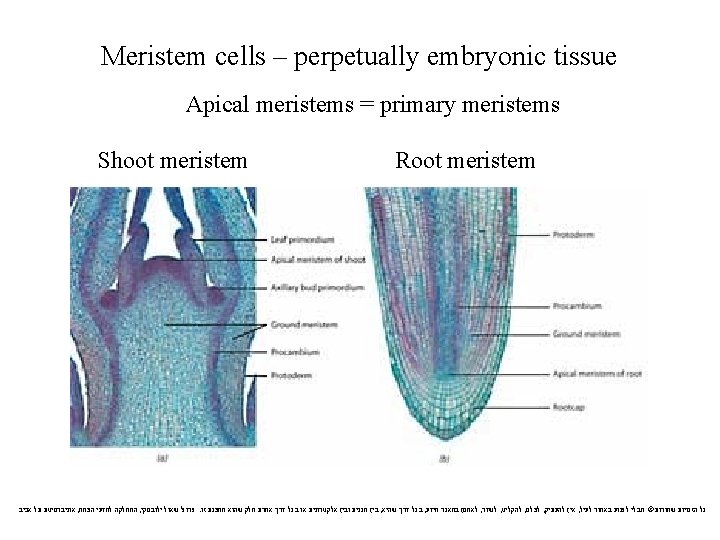 תאי גזע - תאים מריסטמתים A. Meristems give rise to a)Initials, also called stem cells, which remain in the meristem b)Derivatives, which become specialized in mature tissues B. In woody plants, primary growth and secondary growth occur simultaneously but in different locations © 2015 Pearson Education Ltd