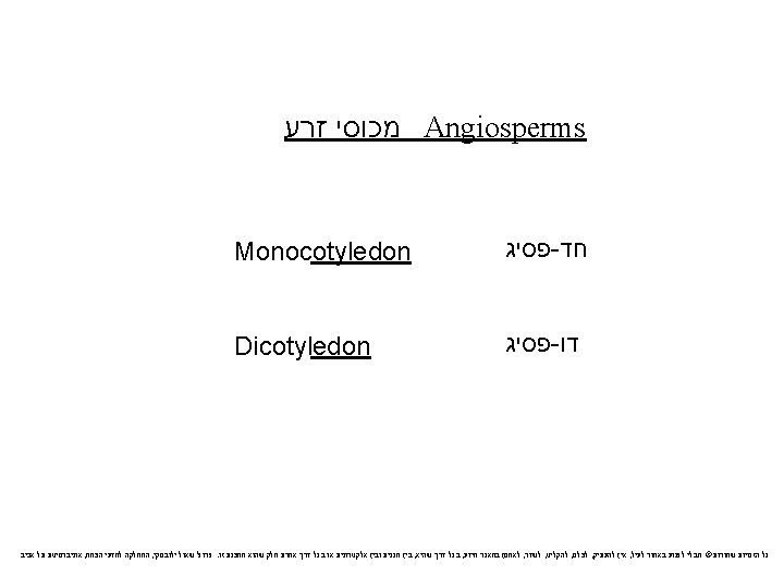 Angiosperms-Flowering plants אבולוציה של מכוסי הזרע Chlorophytes Bryophytes Vascular Plants Gymnosperms Angiosperms - מחלקות פסיגים - דו פסיגים - חד 150 MYA צמחים בעלי זרעים צמחים ווסקולרים Embryophytes First- oxygen; chloroplast; stem; leaves: Ohad N. , Dep. of Plant Sciences, TAU כול הזכויות שמורות צמחים בעלי עוברים seeds; flowers