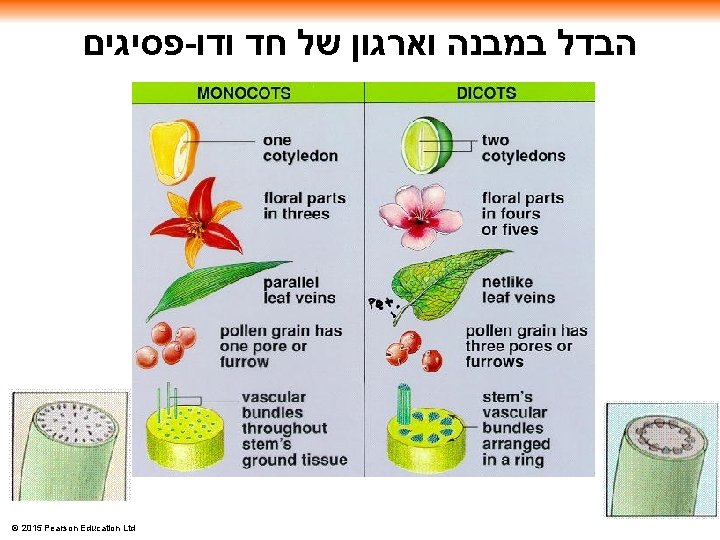 Angiosperm Diversity a) Angiosperms comprise more than 250, 000 living species b) Previously, angiosperms were divided into two main groups a) Monocots (one cotyledon) חד פסיגים b) Dicots (two dicots) פסיגים - דו c) DNA studies suggest that dicots are paraphyletic פסיג עלה עוברי ראשון © 2015 Pearson Education Ltd
