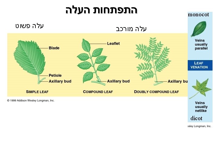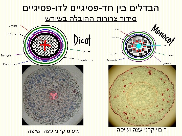 השוואה בין חד פסיגים לדו פסיגים Embryos Leaf venation One cotyledon Veins usually parallel Stems Roots Pollen Flowers Pollen grain with one opening Floral organs usually in multiples of three Taproot Pollen grain (main root) with three usually present openings Floral organs usually in multiples of four or five Monocot Characteristics Root system Vascular tissue usually fibrous scattered (no main root) Eudicot Characteristics Vascular tissue Two Veins usually arranged cotyledons netlike in ring Figure 30. 16