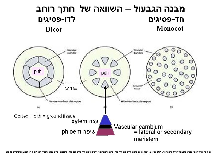 פסיגים - התעבות משנית בדו a) In a typical woody stem, the vascular cambium is located outside the pith and primary xylem and to the inside of the primary phloem and the cortex b) In a typical woody root, the vascular cambium forms exterior to the primary xylem and interior to the primary phloem and pericycle © 2015 Pearson Education Ltd