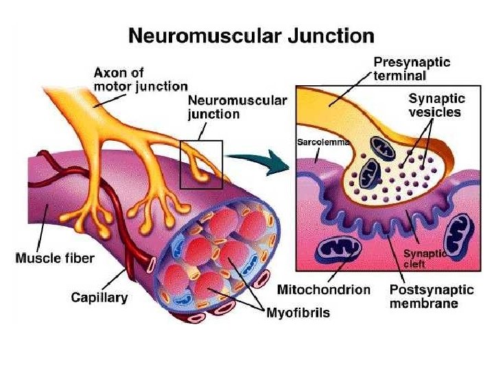 Neuromuscular Junction � “Joining” of motor ______ and ______ � ________-motor neurons release _________ that diffuse across synapse to receptors on muscle fiber membrane � Always _______ � Motor unit_______branched motor ____ synapsing with ______ muscle _______