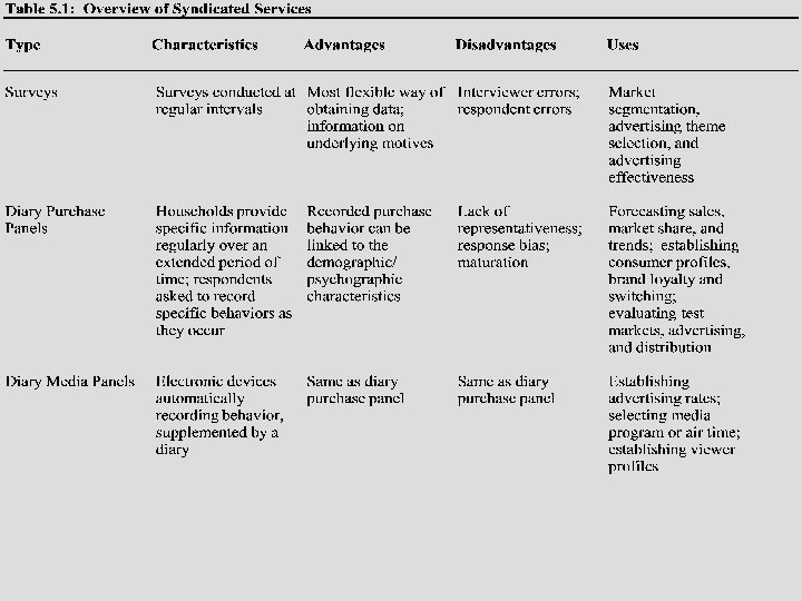 Table 5. 1: Overview of Syndicated Services (Cont. ) Type Characteristics Advantages Disadvantages Uses Scanner Diary Panels with Cable TV Scanner panels of households that subscribe to cable TV Data reflect actual purchases; sample control; ability to link panel data to household characteristics Data may not be representative; quality of data limited Promotional mix analyses, copy testing, new-product testing, positioning Audit Services Verification of product movement by examining physical records or performing inventory analysis Relatively precise information at the retail and wholesale levels Coverage may be incomplete; matching of data on competitive activity may be difficult Measurement of consumer sales and market share, competitive activity, analyzing distribution patterns: tracking of new products Industrial Product Syndicated Services Data banks on industrial establishments created through direct inquiries of companies, clipping services, and corporate reports Important source of information in industrial firms, particularly useful in initial phases of the projects Data is lacking in terms of content, quantity, and quality Determining market potential by geographic area, defining sales territories, allocating advertising budget