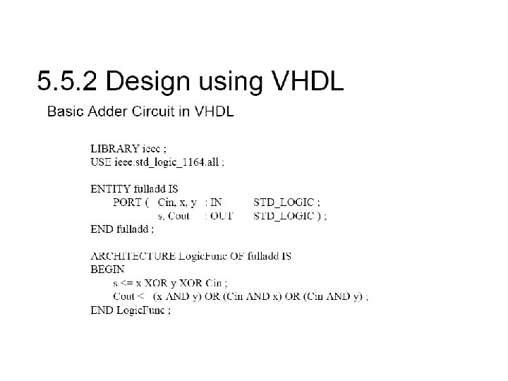 LIBRARY ieee ; USE ieee. std_logic_1164. all ; ENTITY adder 4 IS PORT ( Cin : IN STD_LOGIC ; x 3, x 2, x 1, x 0 : IN STD_LOGIC ; y 3, y 2, y 1, y 0 : IN STD_LOGIC ; s 3, s 2, s 1, s 0 : OUT STD_LOGIC ; Cout : OUT STD_LOGIC ) ; END adder 4 ; ARCHITECTURE Structure OF adder 4 IS SIGNAL c 1, c 2, c 3 : STD_LOGIC ; COMPONENT fulladd PORT ( Cin, x, y : IN STD_LOGIC ; s, Cout : OUT STD_LOGIC ) ; END COMPONENT ; BEGIN stage 0: fulladd PORT MAP ( Cin, x 0, y 0, s 0, c 1 ) ; stage 1: fulladd PORT MAP ( c 1, x 1, y 1, s 1, c 2 ) ; stage 2: fulladd PORT MAP ( c 2, x 2, y 2, s 2, c 3 ) ; stage 3: fulladd PORT MAP ( Cin => c 3, Cout => Cout, x => x 3, y => y 3, s => s 3 ) ; END Structure ; Figure 5. 24 VHDL code for a four-bit adder