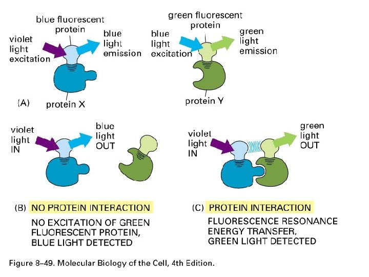 Other uses of Fluorescent proteins FRET - fluorescence resonance energy transfer -can detect changes in interactions -donor FL energy reduced while acceptor increased Bi-molecular complementation Caged proteins