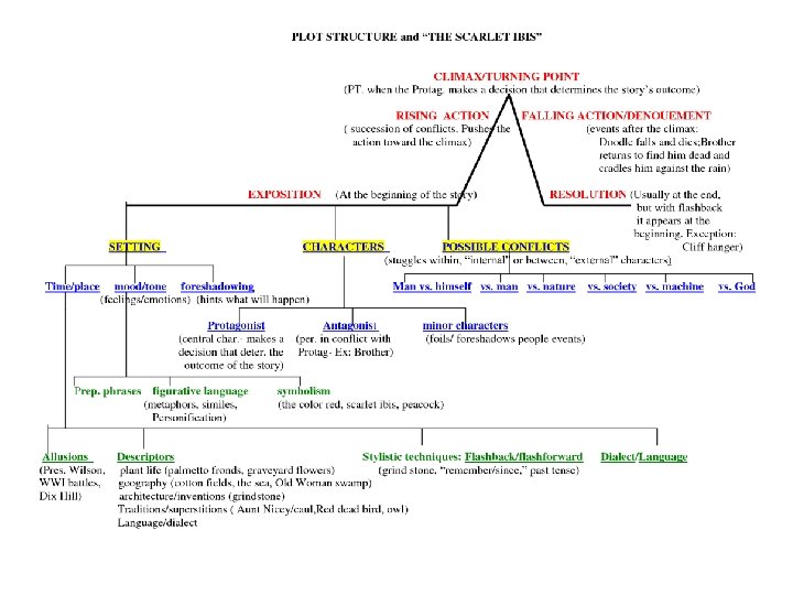 “The Scarlet Ibis” Notes (4 th Period, 384) Define “allegory”: a story or poem in which every element has parallel literal or symbolic meanings. • Define “ibis”: • Setting: Time and place • Characters – Narrator – Doodle • • Plot: Point of view: Irony: Conflict(s): Rising/Falling Action: Theme(s): Unknown terms: