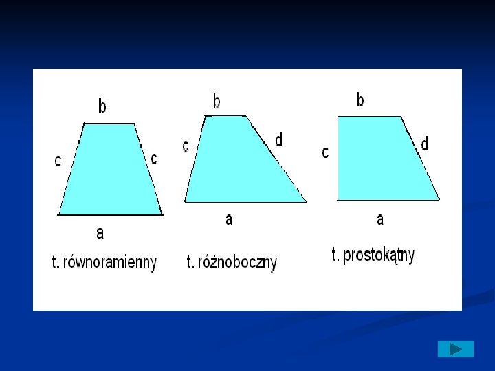 Podział trapezów: n Trapez równoramienny- ma ramiona tej samej długości. n Trapez różnoboczny- ma boki różnej długości. n Trapez prostokątne- ma co najmniej dwa kąty proste.