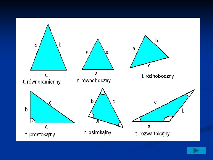 Podział trójkątów Trójkąty dzielimy ze względu na długości ich boków i względu na miary ich kątów. Podział ze względu na boki: n Trójkąt równoboczny- ma boki tej samej długości n Trójkąt równoramienny- ma dwa boki tej samej długości n Trójkąt różnoboczny- ma każdy bok innej długości Podział ze względu na kąty: n Trójkąt prostokątny- ma jeden kąt wewnętrzny prosty n Trójkąt ostrokątny- ma wszystkie kąty wewnętrzne ostre n Trójkąt rozwartokątny- ma jeden kąt wewnętrzny rozwarty
