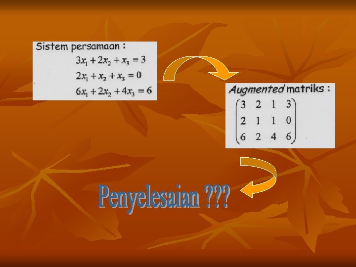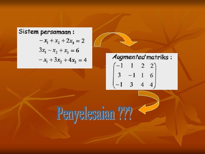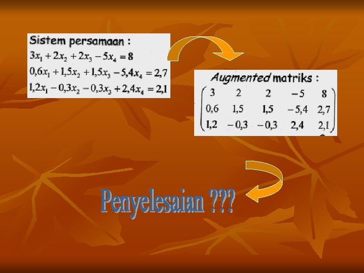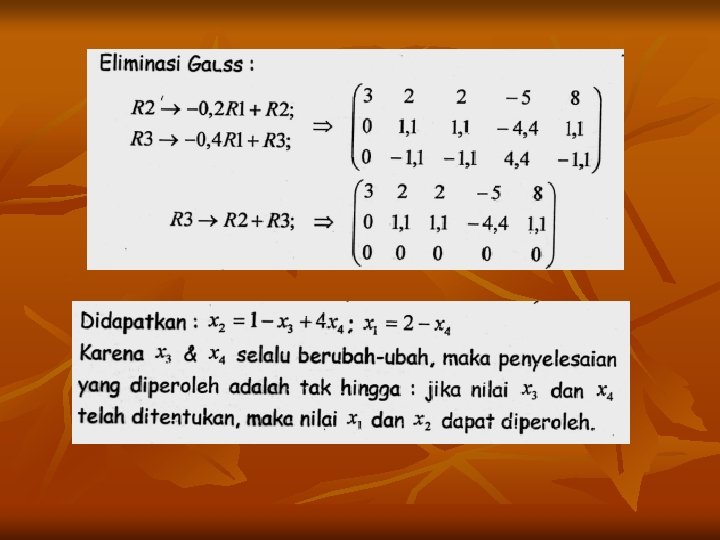Latihan n Selesaikan sistem persamaan berikut dengan menggunakan metode eliminasi gauss