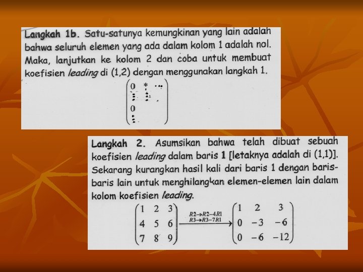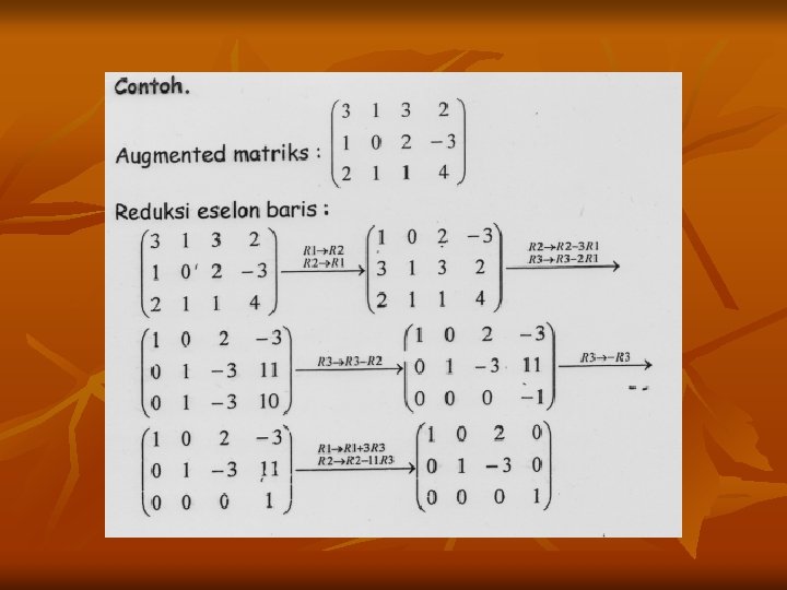 Sifat - Sifat n n Elemen tidak nol yang pertama dalam baris (jika ada) adalah “ 1” (koefisien leading) Koefisien leading adalah satu-satunya elemen tidak nol yang ada dalam kolomnya Semua baris yang terdiri dari nol-seluruhnya (jika ada) diletakkan dibawah matriks. Bentuk koefisien leading adalah berpola “anak tangga” dari kiri ke kanan
