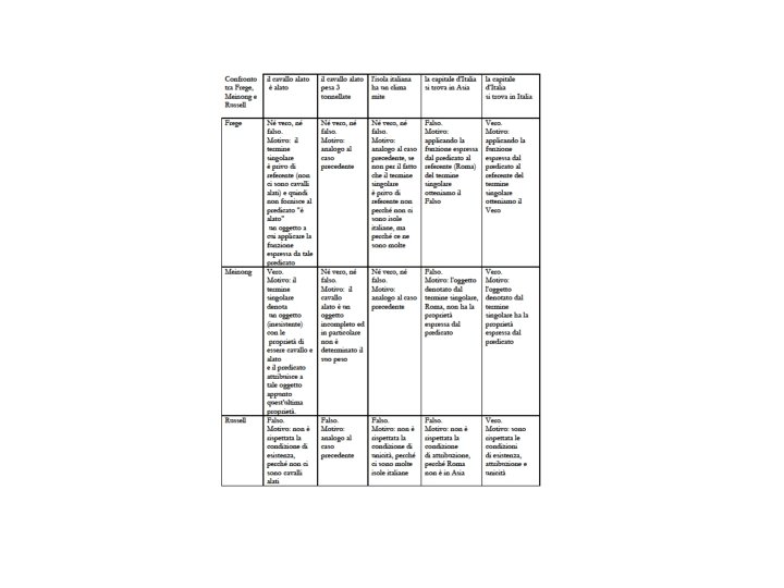 Le critiche di Russell a Meinong • (R 1) l’ammissione di oggetti impossibili comporta il rifiuto della legge logica di non contraddizione. • (R 2) L'enunciato "l’esistente quadrato rotondo è esistente" dovrebbe essere considerato vero da Meinong. • (R 3) Date queste difficoltà, e dal momento che la teoria delle descrizioni ci spiega come fare a meno di oggetti inesistenti, è meglio negare che vi siano oggetti inesistenti.