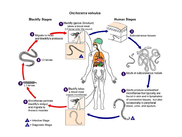 Onchocerca: Parasites remain near bite site in nodules Vectors are blackflies- require fast flowing water Adults in nodules sometimes encapsulated by host tissues Microfilariae move around in circulation- elicit little response Problem is when large numbers of mf enter the eyes Impaired vision-blindness. Eye lesions take many years to develop. Some mf directly damage eyes. When they die – lesions, chronic inflammation fibroblast proliferation, chronic inflammatory infiltrates Sclerotising keratitis- hardening inflammation of the cornea Treatment: Nodule removal Chemotherapy with ivermectin yearly treatment Eliminates skin mf, suppresses release from females, kills females slowly