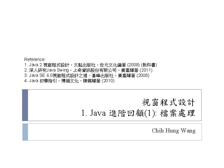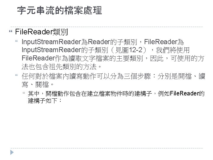 字元串流的檔案處理 File. Reader類別 13 14 15 16 17 18 19 20 21 22 23 char cbuf[] = new char[256]; File. Reader fr = new File. Reader("c: \my. Java\ch 12\file\text 1. txt"); int num = fr. read(cbuf); //讀取最多 256個字元到cbuf陣列中 String str 1 = new String(cbuf, 0, num); //字元陣列轉換為字串 System. out. println("總共讀取" + num + "個字元數"); System. out. println("檔案內容如下"); System. out. println(str 1); fr. close(); //關檔 text 1. text(隨書光碟 my. Javach 12filetext 1. txt) } }